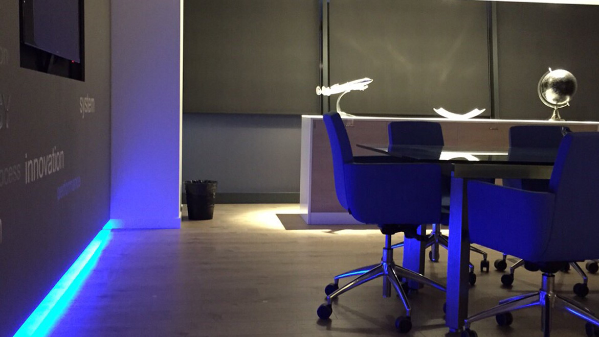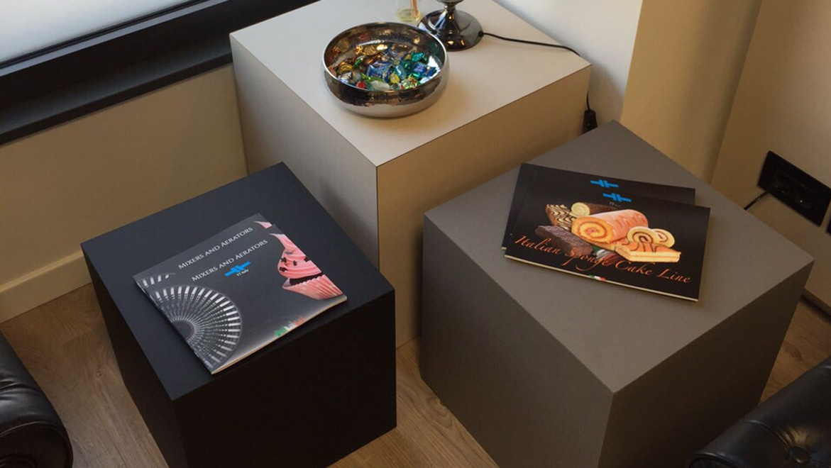 Arredo sala riunioni: colori caldi e una parete di comunicazione con scritte adesive e inserti in plexiglass che descrivono la realtà di questa azienda che produce linee di macchinari per dolci.